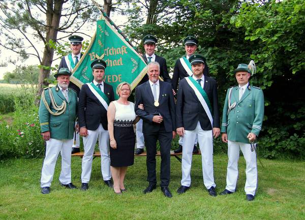 Oberst Franz Josef Segbert, Ehrendame Jenna Bietenbeck, Ehrenherr Johannes Wiesweg, Königin Charlotte Messing, König Steffen Niewerth, Ehrendame Christin Niewerth, Ehrenherr Maximilian Korth Hinten: Adjutanten Björn Hölker und Fahnenoffiziere Julian Plesker, Mathias Hüppe und Sebi Voßkühler